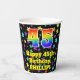 This joyful and exciting birthday paper cup design features a large number “45” having a rainbow spectrum gradient inspired pattern. It also features the message “Happy 45th Birthday,”, and a customisable name. The background features a multicolored pattern featuring many star shapes with different colours and sizes. Colourful, vibrant paper cups like this might be fun to have at a birthday party/celebration being held to honour somebody’s 45th birthday. [~Z0000540]