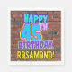 This fun birthday-themed paper napkin design features the message “HAPPY 45TH BIRTHDAY,” having a vibrant, colorful, urban street art and graffiti inspired appearance, in addition to a personalized recipient name. The background features a brick wall inspired pattern. Fun, vibrant, personalized paper napkins like this might be fun to use at a birthday party being held for somebody who is celebrating their 45th birthday. [~Z0000534]