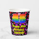 This colourful and cheerful birthday-themed paper cup design features a large number “45” having a rainbow spectrum gradient inspired pattern. It also features the message “Happy 45th Birthday,”, and an editable name. The background features a pattern of purple, red, and pink heart shapes of various sizes. Joyful, friendly paper cups like this might be fun to have at a birthday party being held to celebrate somebody’s 45th birthday. [~Z0000548]