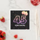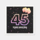 Party balloons and confetti on black background with the neon number 45 for a 45th birthday party.