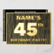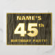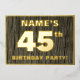 The front of this bold forty-fifth birthday celebration foil invitation card features a custom name, a large number “45th”, the message “BIRTHDAY PARTY!”, and a border, all in foil. There is a rustic, yet sophisticated, faux wood grain look inspired pattern for the background of the front. The back features personalised details about the event, such as the date, time, location/venue, and any other important information. Personalised invitations like these might be used to invite attendees/guests to a birthday party being held to honour somebody’s 45th birthday. [~Z0000598]
