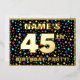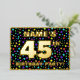 The front of this upbeat forty-fifth birthday party/celebration foil invitation card design features an editable name, a large number “45th”, the message “BIRTHDAY PARTY!”, and a border. The background of the front features an exciting, multicolored pattern of star shapes. The back features personalised details about the event, such as the date, time, location/venue, and any other useful information. Editable invitations like these might be a fun way to invite attendees/guests to a birthday gathering being held to honour somebody’s 45th birthday. [~Z0000600]