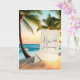 A blank invitation paper with an envelope rests on a sandy beach against the backdrop of gently swaying palm trees and a serene ocean under a vibrant sunset for 45th anniversary.
