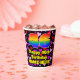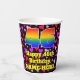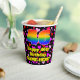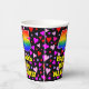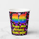 This happy and fun birthday-themed paper cup design features a large number “46” with a rainbow spectrum gradient inspired pattern, along with the message “Happy 46th Birthday,”, and a customisable name. The background features a pattern of purple, pink, and red heart shapes of various sizes. Fun, happy paper cups like this might be fun to use at a birthday party being held in celebration of somebody’s 46th birthday. [~Z0000548]