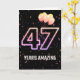 Party balloons and confetti on black background with the neon number 47 for a 47th birthday.