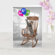 Playful tabby cat standing on a wooden rocking chair and reaching for a colourful balloon bouquet for 47th birthday.