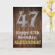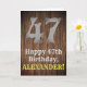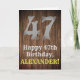 This country inspired and American Wild West inspired birthday-themed greeting card design features a large rustic look number "47", the message "Happy 47th Birthday,", a personalised name, and a faux/imitation wood grain inspired look pattern background. The inside has a customised birthday greeting message, or could perhaps be cleared and left blank if a message is to be written by hand instead. A customised birthday greeting card like this might be sent in celebration of somebody’s forty-seventh birthday. [~Z0000469]