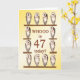47th birthday card. Curious owls turning their heads to look at you and asking 'Who has a birthday today?'. A funny birthday card for anybody who likes owls. The owls shown are barn owls.