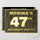 The front of this bold forty-seventh birthday party foil invitation card features a personalised name, a large number “47th”, the message “BIRTHDAY PARTY!”, and a border, all in foil. The background of the front features a rustic, yet elegant, faux wood grain appearance inspired pattern. The back features personalised details about the event, such as the date, time, venue, and any other information that may be important. Customisable invitations like these might be used to invite guests/attendees to a birthday gathering/party being held to celebrate somebody’s 47th birthday. [~Z0000598]