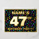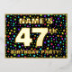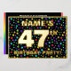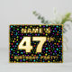 The front of this vibrant forty-seventh birthday party foil invitation card design features a customisable name, a large number “47th”, the message “BIRTHDAY PARTY!”, and a border. The background of the front has a joyful, multicolored starfield pattern. The back features personalised details about the event, such as the date, time, place, and any other useful information. Customisable invitations like these might be a fun way to invite attendees to a birthday party being held in celebration of somebody’s 47th birthday. [~Z0000600]