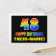 The front of this cheerful, colourful, and fun birthday-themed postcard design features a large number "48" and the message "HAPPY BIRTHDAY,", both having a rainbow spectrum gradient inspired pattern colouring, along with a bold yellow editable recipient name. The front also features a plain black coloured background. The back of the postcard features a custom birthday greeting message, or could perhaps be cleared and left blank if a message is to be written by hand instead. A cheerful customisable birthday postcard like this might be a fun way to send a message in celebration of somebody’s forty eighth birthday. [~Z0000474]