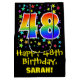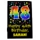This vibrant, fun, and colourful birthday-themed gift bag design features a large number "48" with a rainbow spectrum gradient inspired pattern, along with the message "Happy 48th Birthday,", and an editable recipient name. It also has a colourful background pattern featuring variously-sized star shapes. A fun gift bag like this might be used when wrapping presents being given to somebody in celebration of their forty eighth birthday. [~Z0000510]