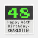 This geeky and nerdy birthday themed paper napkin design features a large green retro video game style number "48" on a black colored background. It also features the birthday greeting message "Happy 48th Birthday,", and a name that can be personalized. Fun and geeky paper napkins like this might be used at a party being held in celebration of the forty eighth birthday of an engineer, a computer programmer, or somebody who enjoys video gaming. [~Z0000404]