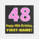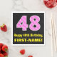 This joyful and fun birthday-themed paper napkin design features a large number "48" with a light pink and dark pink stripes pattern containing heart shapes. It also features the birthday greeting message "Happy 48th Birthday,", and a customisable name. Paper napkins like this might be nice to have at a party being held to celebrate somebody’s forty eighth birthday. It might also be a fun choice for somebody whose birthday falls on February 14 (Valentine's Day), due to its loving heart symbols and colours. [~Z0000436]