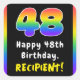 This bold and fun birthday square sticker design features a large number “48“ with a vibrant multicolored rainbow spectrum inspired gradient pattern, along with the message “Happy 48th Birthday,”, and a personalized recipient name. Cheerful birthday themed stickers like these might be used or given out at a party celebrating somebody’s forty eighth birthday, or perhaps used when wrapping gifts or preparing invitations for such an event. [~Z0000630]