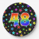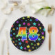 This fun, colourful, and cheerful paper plate design features a large number "48" coloured with a rainbow spectrum gradient inspired pattern. The background features a colourful pattern of star shapes. Paper plates like this might be fun to use at a celebration being held to honour somebody who is celebrating their 48th birthday, or a couple’s forty eighth anniversary, or some other 48th event. [~Z0000493]