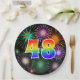 This cheerful, fun, and colourful paper plate design features a large number "48" coloured with a rainbow spectrum gradient inspired pattern. It also features a vibrant and exciting bursting celebratory fireworks inspired pattern. The background is coloured black. Fun paper plates like this might be used at somebody’s forty eighth birthday celebration, a 48th anniversary party, or some other 48th event. [~Z0000490]