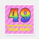 This happy and fun 49th birthday-themed paper napkin design features a large number "49" having a colourful pattern inspired by the look of a rainbow spectrum. It also features the message "Happy 49th Birthday,", followed by a customisable name. The background features a pattern of light pink and dark pink stripes containing loving pink heart shapes. Fun, personalised paper napkins like this might be used at a party being held to celebrate somebody’s forty ninth birthday. [~Z0000417]