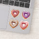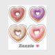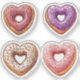 Four heart-shaped doughnuts with red, white, purple, and pink frosting topped with sprinkles. They're yummy-looking and fun!