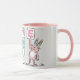 Fun Rabbit Design Mug for someone with a 4 Letter Name. Example name is Dave. Cute baby rabbits. Fun pink, grey, and white mug with illustration of Rabbits in pink and blue. The rabbits are holding up cards to spell out the name.
