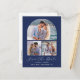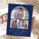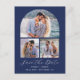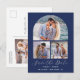 This simple, minimalist Save the Date postcard features an arch-shaped collage of three photos: one horizontal and two smaller squares. Below, the words "Save the Date" appear in elegant white handwriting script, followed by the couple's names, wedding date and city in sans serif font on a navy blue background. Add a fourth, horizontal photo to the back, along with your return address and additional details.