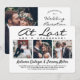 Invite family and friends to a simply elegant marriage celebration with this stylish modern "At Last Let's Celebrate" photo collage wedding invitation. All wording is simple to personalise for any event type, including a reception only post elopement party, vow renewal ceremony, sequel wedding, 1st anniversary reception, cocktail hour or dinner party. Customise it to include the details of your choice, such as marriage date, dress code, rsvp, website, etc. (IMAGE PLACEMENT TIP: An easy way to centre a photo exactly how you want is to crop it before uploading to the Zazzle website.) The modern minimalist black and white design features four pictures of the newlywed couple, trendy handwritten script calligraphy, and chic typewriter style typography. Whether you eloped, had a smaller downsized minimony or micro wedding, or your special day celebration had to be rescheduled due to a covid pandemic related postponement, the happily ever after party can still get started. Congratulations to the bride and groom!