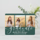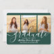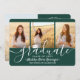 Share the joy of a high school or college graduation and invite family and friends to celebrate with these custom 4 photo collage green and white invitations. All pictures and wording are simple to personalize. (IMAGE PLACEMENT TIP: An easy way to center a photo exactly how you want is to crop it before uploading to the Zazzle website.) This template is formatted for a graduation party, but can easily be customized as an open house invite or announcement card. Simply change the text to include any details of your choice, such as parents' names, special honors, degree title, favorite inspirational quote, graduate's future plans or new address. If there's any text not wanted simply delete it. Design features a dark green background, white mortar board cap, handwritten style script calligraphy, modern minimalist typography, and four photos of your choice, such as senior pictures or images from the commencement ceremony. This elegant graduation invitation card is a trendy and chic way to begin your special day celebration. Congratulations to the graduate!