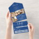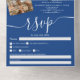 Chic blue white elegant classic call in one calligraphy wedding invitation with rsvp, accommodations, details, and more info. With a modern and trendy script, add 4 of your photos.