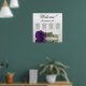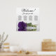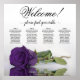 This stunning wedding seating chart has four tables with 10 seats per table, accommodating a total of 40 guests. The chart is adorned with a sophisticated and romantic design, featuring a single long-stemmed rose in a rich deep royal purple shade, delicately resting on its side and casting a reflection in a serene pool of water. The chart's title, written in graceful script calligraphy, warmly welcomes guests with "Welcome! Please find your table" while leaving ample space below for the names of the couple and wedding date. This elegant seating chart serves as a charming and practical way to greet and assist your guests in finding their designated seats at your wedding reception.