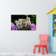 4 adorable yellow kittens sitting on a log surrounded by purple flowers.