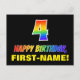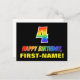 The front of this colourful, fun, and cheerful birthday-themed postcard design features a large number "4" and the message "HAPPY BIRTHDAY,", both having a rainbow spectrum gradient inspired pattern colouring, along with a bold yellow custom recipient name. The front also features a simple black coloured background. The back of the postcard has a customisable birthday greeting message, or could perhaps be cleared and left blank if a message is to be written by hand instead. A colourful customisable birthday postcard like this might be a fun way of celebrating somebody’s fourth birthday. [~Z0000474]
