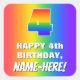 This joyful and cheerful birthday themed square sticker design features a large number “4” with a colourful rainbow spectrum inspired gradient pattern, along with the message “HAPPY 4th BIRTHDAY,”, and an editable recipient name. The background also features a fun multicolored rainbow spectrum inspired gradient pattern. Fun, personalised stickers like this might be given as a birthday present, or used while wrapping gifts, or perhaps used as birthday party decorations when celebrating somebody’s fourth birthday. [~Z0000571]