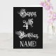 The front of this ornate and opulent birthday greeting card design features the message “Happy 4th Birthday,” in formal script style text, on a black coloured background. The inside has a personalised birthday greeting message, or could perhaps be cleared and left blank if a message is to be written by hand instead. A fancy, customised birthday greeting card like this might be a respectable way to deliver birthday greetings to somebody who is celebrating their fourth birthday. [~Z0000554]