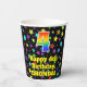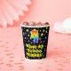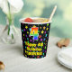 This cheerful and joyful birthday paper cup design features a large number “4” with a rainbow spectrum gradient inspired pattern, along with the message “Happy 4th Birthday,”, and a customisable name. The background features a multicolored star field inspired pattern. Colourful, vibrant paper cups like this might be fun to use at a birthday celebration/party being held to honour somebody’s fourth birthday. [~Z0000540]
