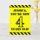 The front of this attention-grabbing and bold birthday-themed greeting card design features a personalised name and the message "YOU’RE NOW 4 YEARS OLD!" in black stencil look text on a yellow coloured background. The front also features an eye-catching black and yellow striped pattern at the top and bottom edges. The inside features a custom birthday greeting message, or could perhaps be cleared and left blank if a message is to be written by hand instead. A personalised birthday card like this might be a fun way to send birthday wishes to somebody who is celebrating their fourth birthday. [~Z0000413]