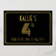 The front of this 1920s/1930s style inspired fourth birthday celebration/party foil invitation features an editable name, a large art deco look inspired number “4TH”, the message “BIRTHDAY PARTY!”, and a border pattern consisting of lines. There is a black-coloured background on the front by default, but it can be customised to a different colour if desired. The back features personalised details about the event, such as the date, time, location, and any other relevant information. Elegant, luxurious, customisable invitations like these might be used to invite guests to a birthday celebration/party being held to celebrate somebody’s 4th birthday. [~Z0000590]