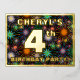 The front of this bold and eye-catching fourth birthday celebration/party foil invitation postcard design features a customisable name, a large number “4th”, the message “BIRTHDAY PARTY!”, and a border. The background of the front has a joyful, colourful pattern that resembles bursting celebratory fireworks. The back features personalised details about the event, such as the date, time, venue/location, and any other useful information. Customised invitations like these might be a fun way to invite guests to a birthday party being held to honour somebody’s 4th birthday. [~Z0000609]