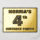 The front of this bold fourth birthday celebration foil invitation card features a custom name, a large number “4th”, the message “BIRTHDAY PARTY!”, and a border, all featuring a rustic, yet elegant, faux wood grain appearance inspired pattern. The back features personalised details about the event, such as the date, time, place/venue, and any other information that may be relevant. Customisable invitations like these might be used to invite guests/attendees to a birthday party/gathering being held to celebrate somebody’s 4th birthday. [~Z0000595]