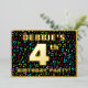 The front of this fun and vibrant fourth birthday party/celebration foil invitation card design features an editable name, a large number “4th”, the message “BIRTHDAY PARTY!”, and a border. The background of the front has an eye-catching, multicolored pattern of music notes. The back features personalised details about the event, such as the date, time, place, and any other relevant information. Personalised invitations like these might be a fun way to invite attendees to a birthday party/gathering being held in celebration of somebody’s 4th birthday. [~Z0000601]