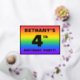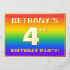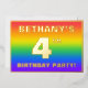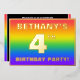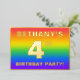 The front of this exciting fourth birthday party/celebration foil invitation card design features a custom name, a large number “4th”, the message “BIRTHDAY PARTY!”, and a border. The background of the front features an upbeat, multicolored, rainbow spectrum inspired gradient pattern. The back features personalised details about the event, such as the date, time, location/venue, and any other information that may be useful. Customised invitations like these might be a fun way to invite guests to a birthday party/gathering being held to honour somebody’s 4th birthday. [~Z0000599]
