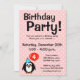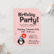 4th Birthday party invitations with funny penguin cartoon. Custom invites for kids birthdays and other fun occasions. Personalizable announcement text, age number and background colour. Girlie pink background with white polka dot pattern. Childrens fourth Birthday template. Age specific, for four year old girl.