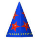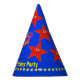 Cute smiling red stars are great fun for a 4 year old’s 4th birthday party. These colourful party hats feature a gang of red stars surrounding one presenting a large number 4 filled with multicolor stars on a bright blue background. A line of yellow stars around the base of the hat set off the custom lettering with the birthday boy’s name.