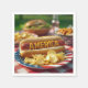 A hot dog with the word "AMERICA" written in mustard is placed on a patriotic flag plate alongside a pile of potato chips