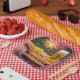 A hot dog with the word "America" in mustard sits on a patriotic flag plate, accompanied by fries and a mug of beer on a red-and-white chequered tablecloth