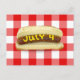 Hot dog on red and white buffalo plaid for 4th of July BBQ party invite.