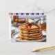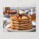 Tall stack of pancakes with dripping syrup and a pat of butter for a 4th of July pancake breakfast.