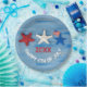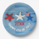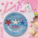 Starfish and American flag on rustic blue wood for 4th of July holiday party.