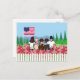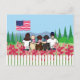 4th of July Three Labradors and Parents Postcard for Labrador Fans! Sweet Chocolate Labrador and Yellow Labrador and Black Labrador with Mum and Dad design. They are sitting on the grass and enjoy mountain view. There are lovely hollyhocks. Created by Naomi Ochiai.