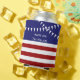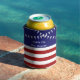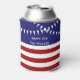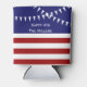 This fun can cooler is decorated with flags and red and white stripes on a patriotic blue background. It is further enhanced with the saying Happy 4th and the family name, which is easy to customise or delete if preferred.