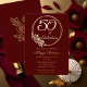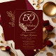 Elegant typography design "50 and Fabulous" 50th birthday party design featuring a rose outline circular frame. Back features a rose outline in gold tone (not gold foil). Front and back background is a dark red burgundy colour.